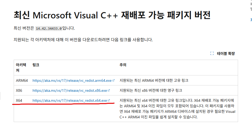 이 문서에는 최신 버전의 Visual C++ 재배포 가능 패키지에 대한 다운로드 링크가 나열되어 있습니다.