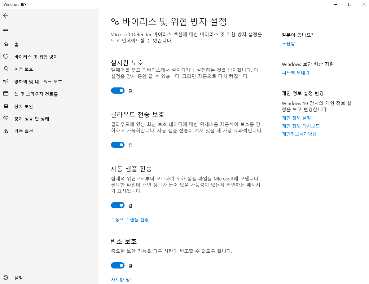 윈도우 디펜더가 자동으로 프로그램을 차단하거나, 성능 저하의 원인이 되는 경우가 많습니다. 백신 프로그램을 따로 사용하는 경우라면 윈도우 디펜더를 끄는 것이 더 효율적일 수 있습니다.