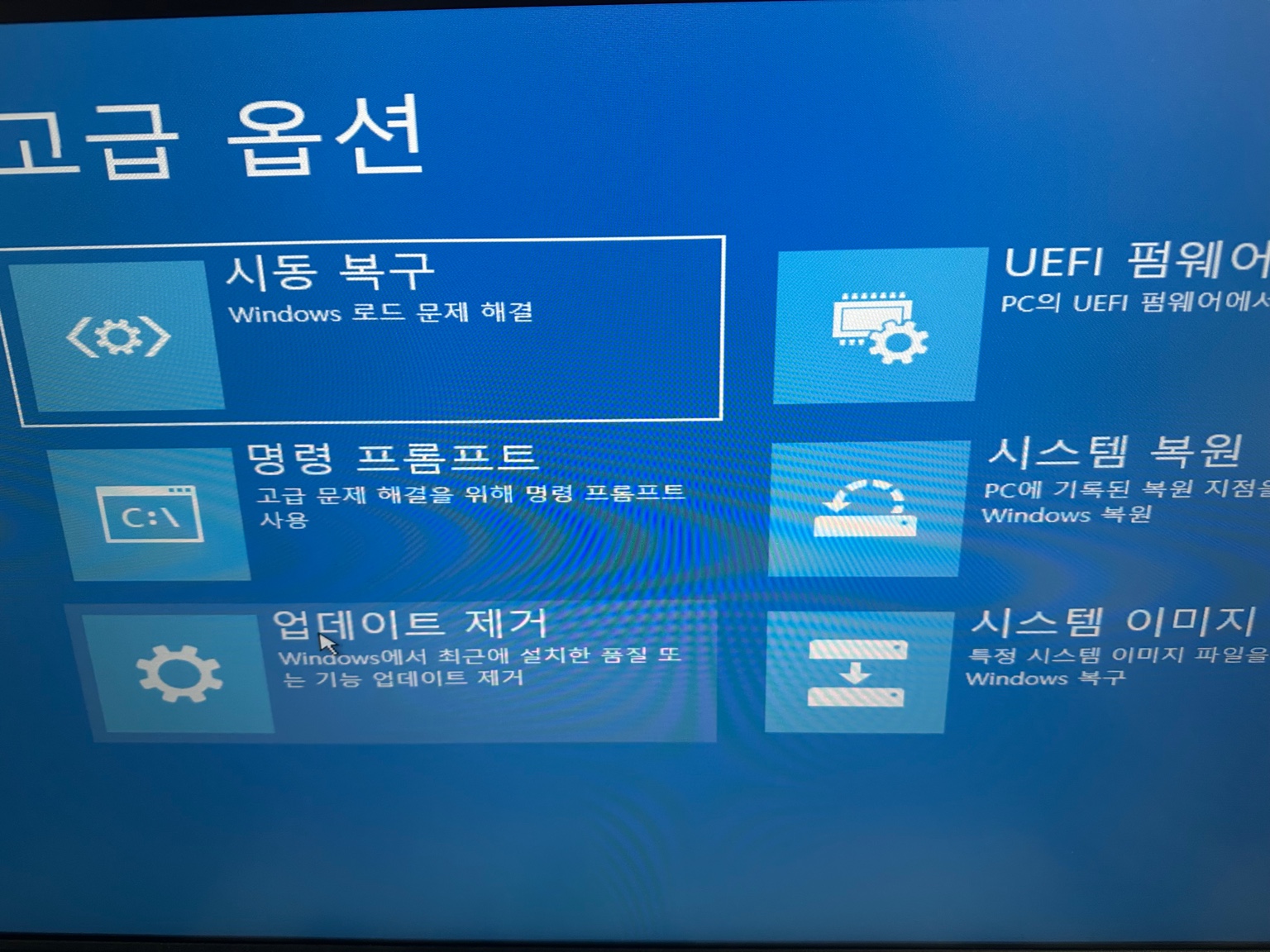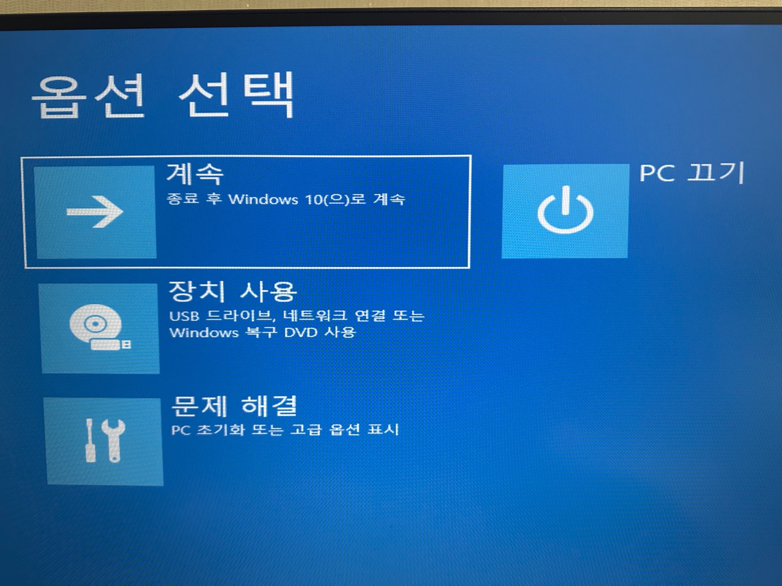 - 자동 복구 반복 시, 고급 복구 옵션 진입 (컴퓨터를 3번연속 강제로 종료 후 재부팅하면 복구모드로 자동으로 진입합니다.)