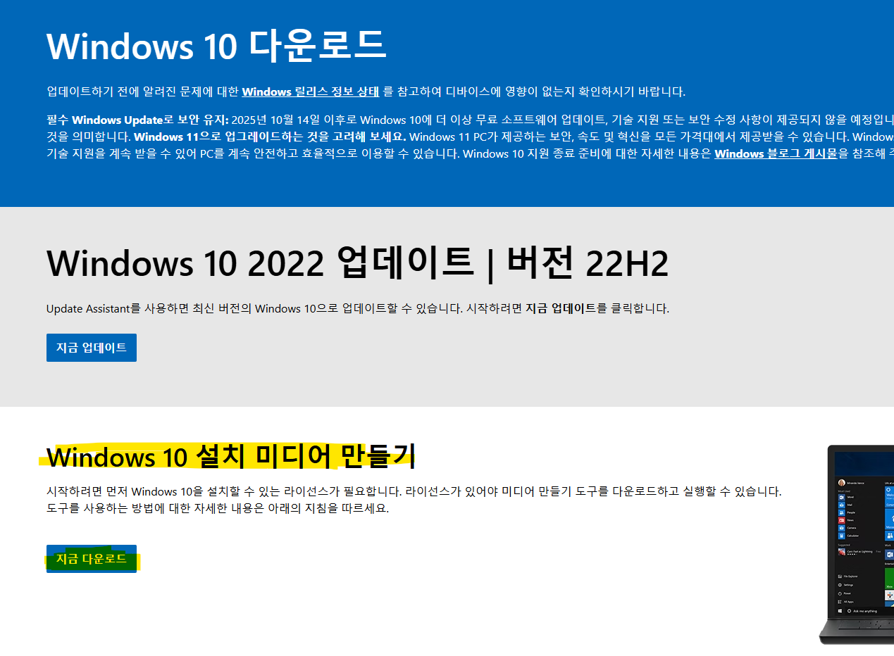 제가 해결한 방법은 윈도우 10 설치 미디어 만들기 다운로드 하신다음에